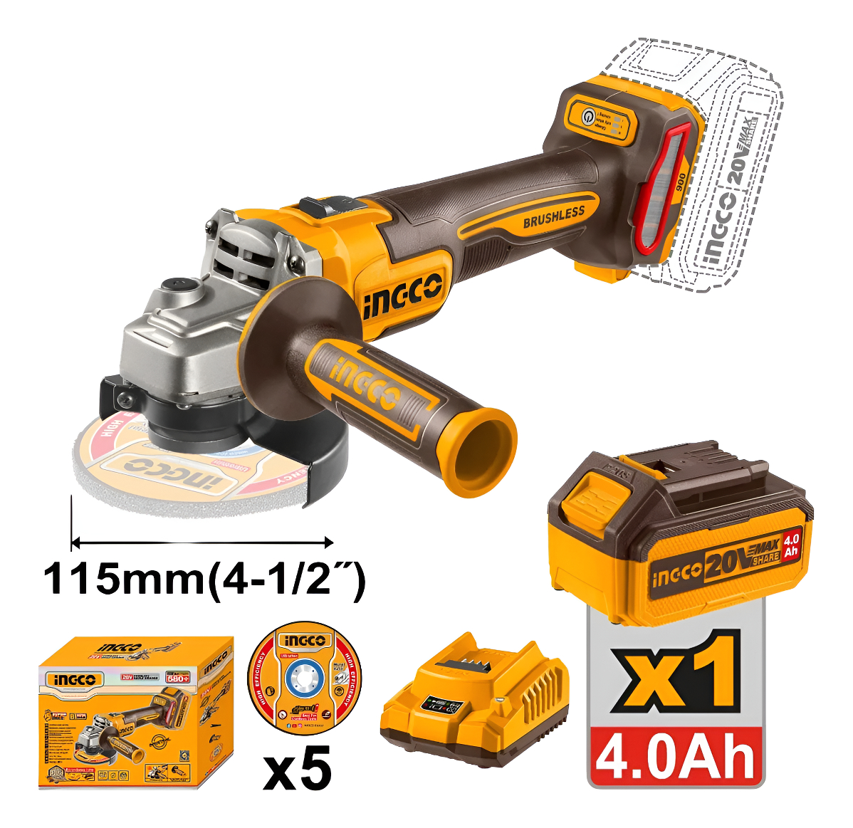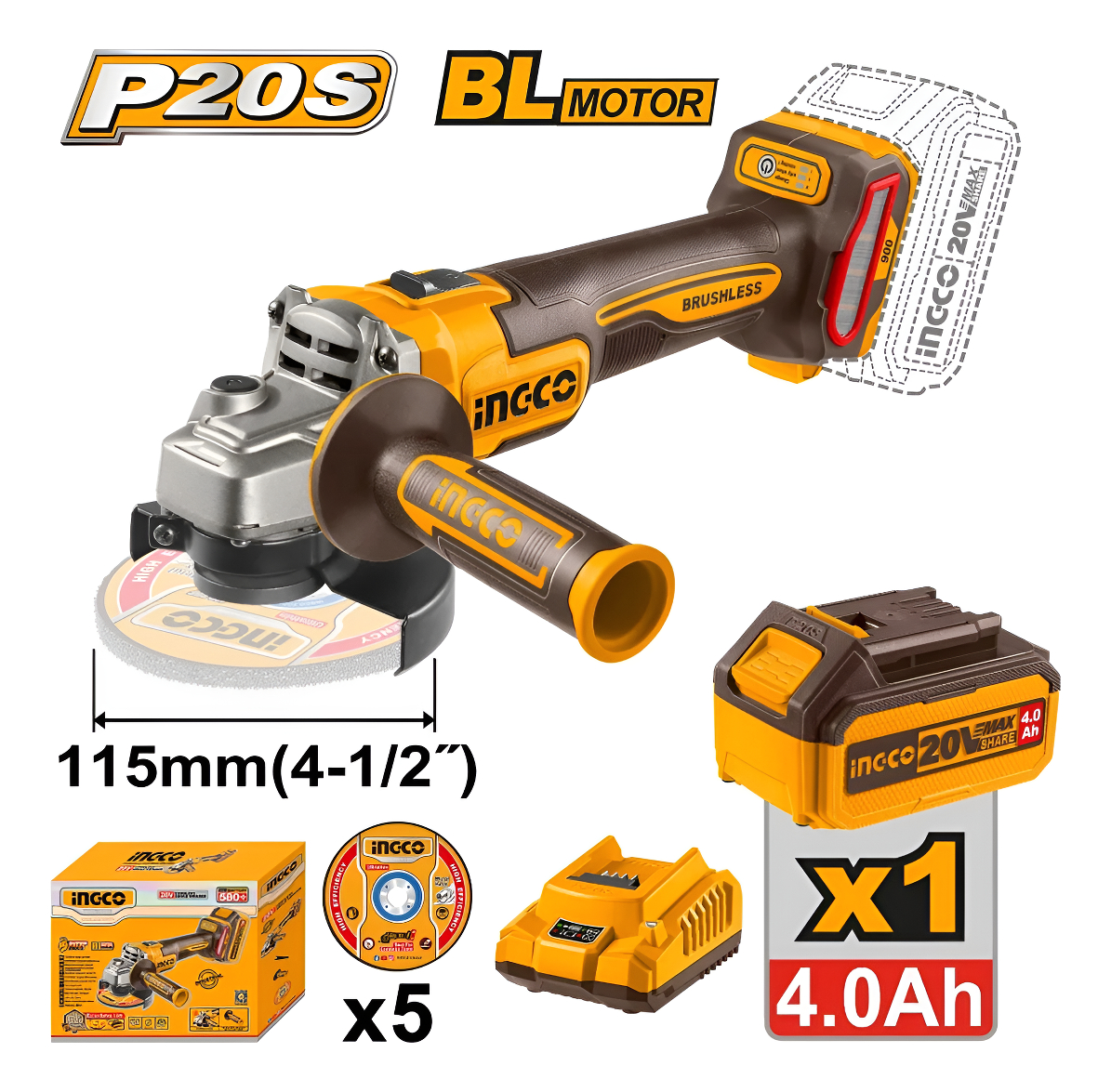 AMOLADORA ANGULAR 115MM A BATERIA P20S 20V BRUSHLESS + 5 DISCOS + BAT 4.0AH + CARGADOR INGCO CAGLI261521