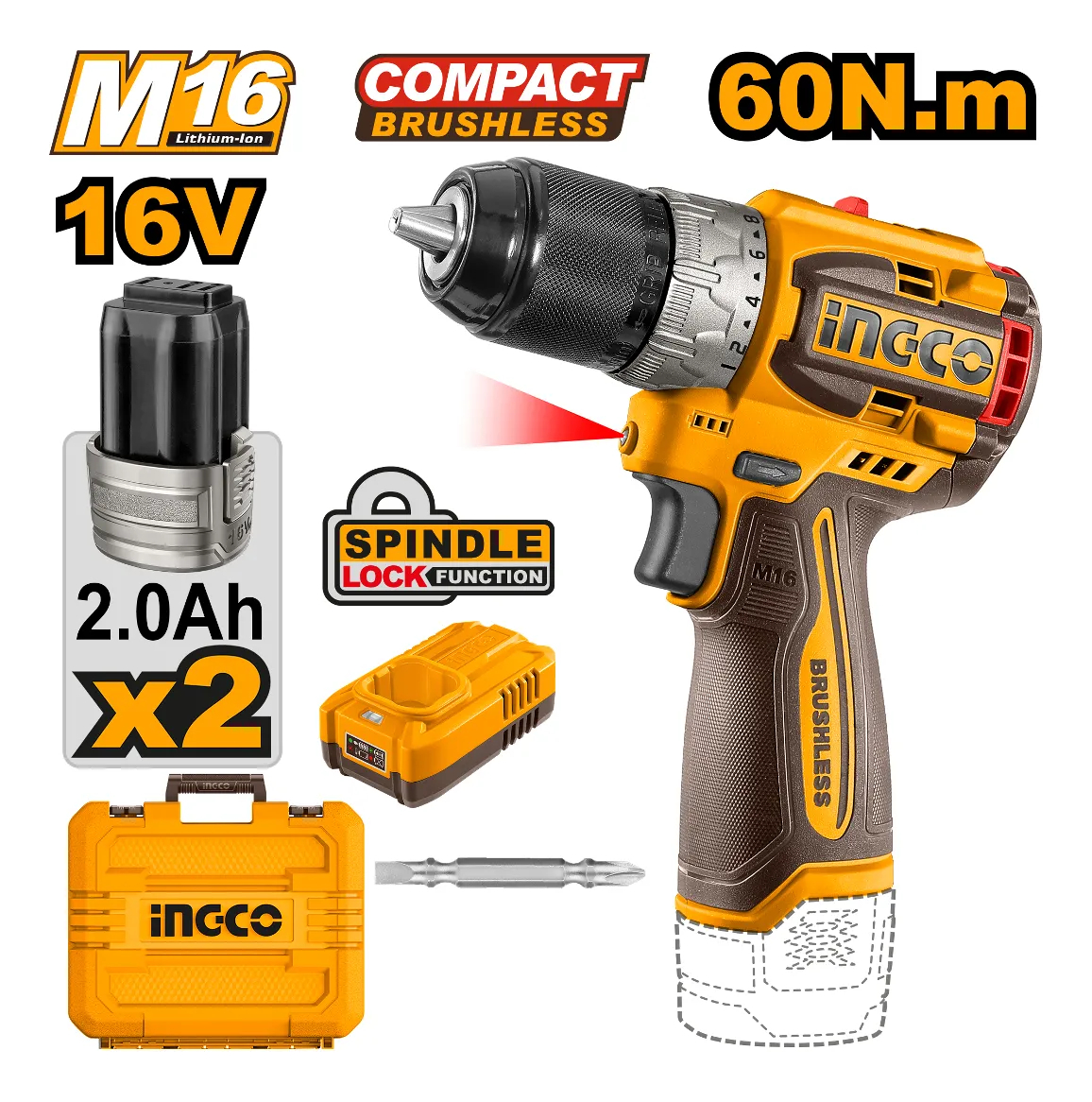 ATORNILLADOR COMPACT A BATERIA 16V M16 C 2 BAT CARG VALIJA INGCO CDLI16682