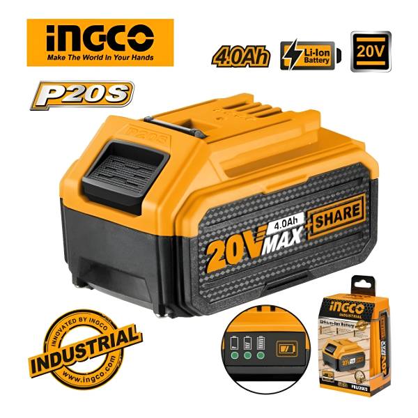 La BaterÃa Ingco de 20V 4.0Ah es la solución perfecta para tus herramientas Ingco, ofreciendo una capacidad de 4.0 amperios-hora que garantiza un rendimiento duradero y eficiente. Fabricada con materiales de litio de alta calidad, esta baterÃa asegura una carga rápida en tan solo 1 hora, permitiéndote volver al trabajo sin largas esperas. Con un voltaje de 20V, es ideal para una amplia gama de herramientas eléctricas recomendadas de la serie P20S. Además, cumple con el número de registro RSPEBT/RSGRA:1111, asegurando su autenticidad y calidad. Aunque es inflamable, su diseño robusto y seguro la hace confiable para cualquier proyecto. Esta baterÃa es nueva y viene en el modelo P20S, garantizando compatibilidad y rendimiento óptimo.