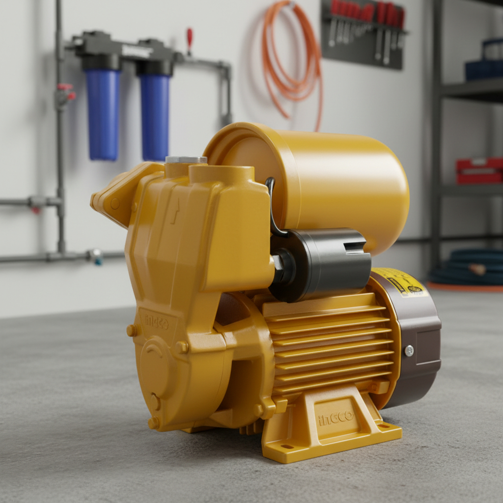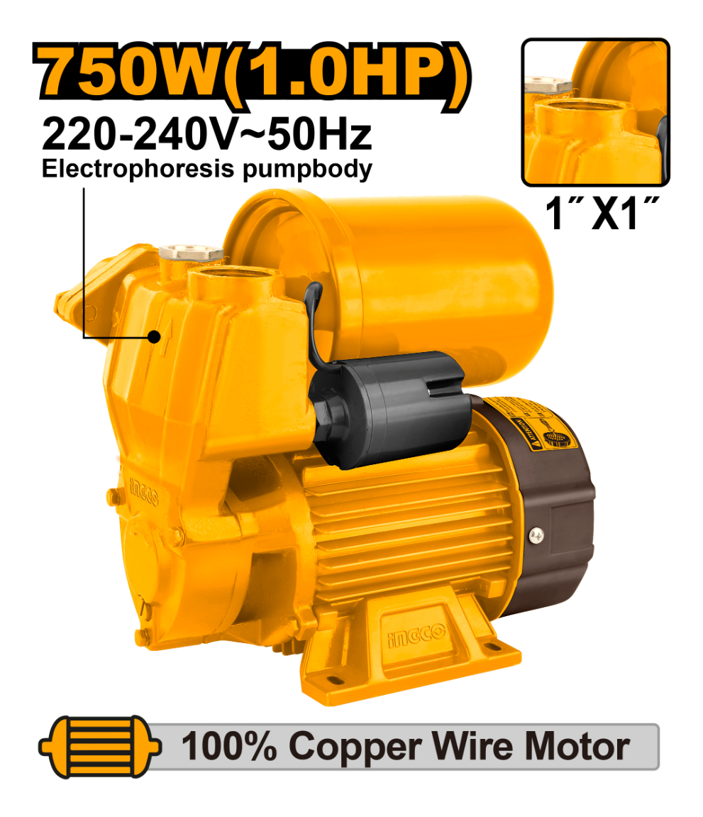BOMBA PERIFERICA 1.0HP 750W CON PRESOSTATO Y TANQUE 2L ALTURA 52M CAUDAL 50L/MIN 220V INGCO