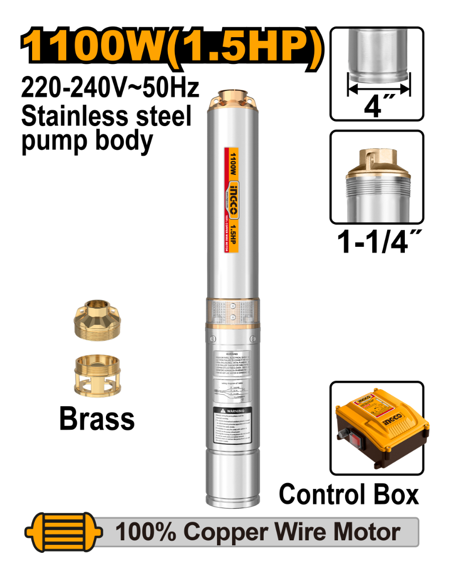 BOMBA SUMERGIBLE TUBO 1100W 1.5HP POZO SEMISURGENTE INGCO