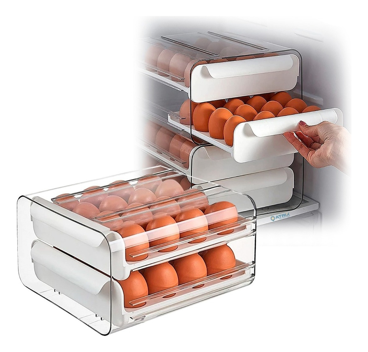 Su diseño de dos pisos moderno y elegante permite almacenar hasta 32 unidades. Cada piso contiene 16 ranuras cónicas que evitan movimiento, roturas o sacudidas de los huevos y también facilitan la inserción y extracción de estos.