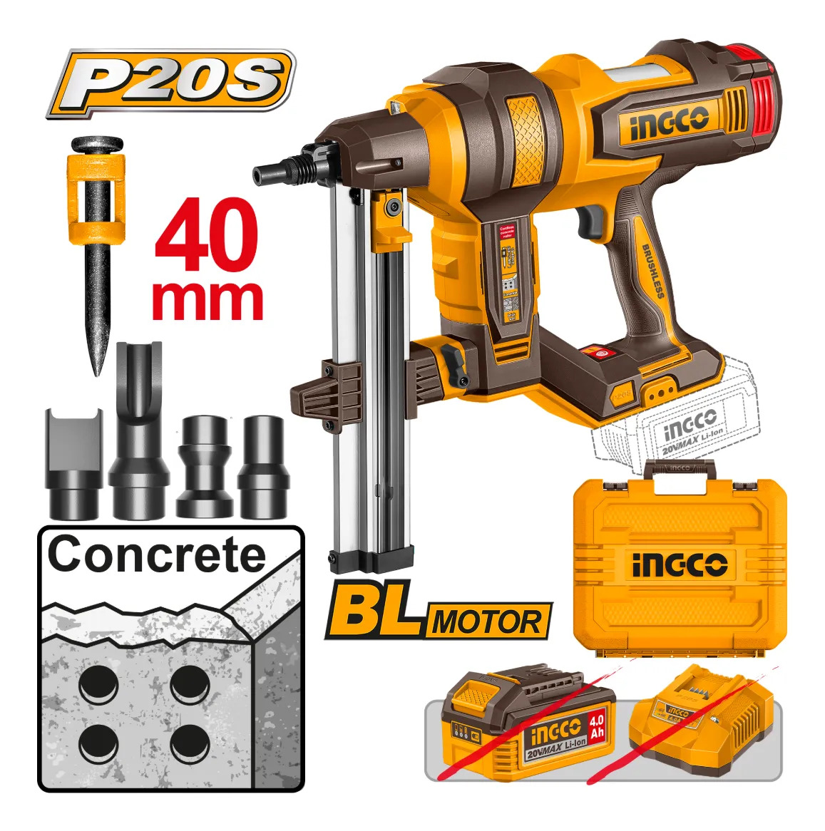 CLAVADORA P/CONCRETO A BATERIA 20V 40MM BRUSHLESS S/BAT S/CARGADOR CON ACCESORIOS + VALIJA INGCO