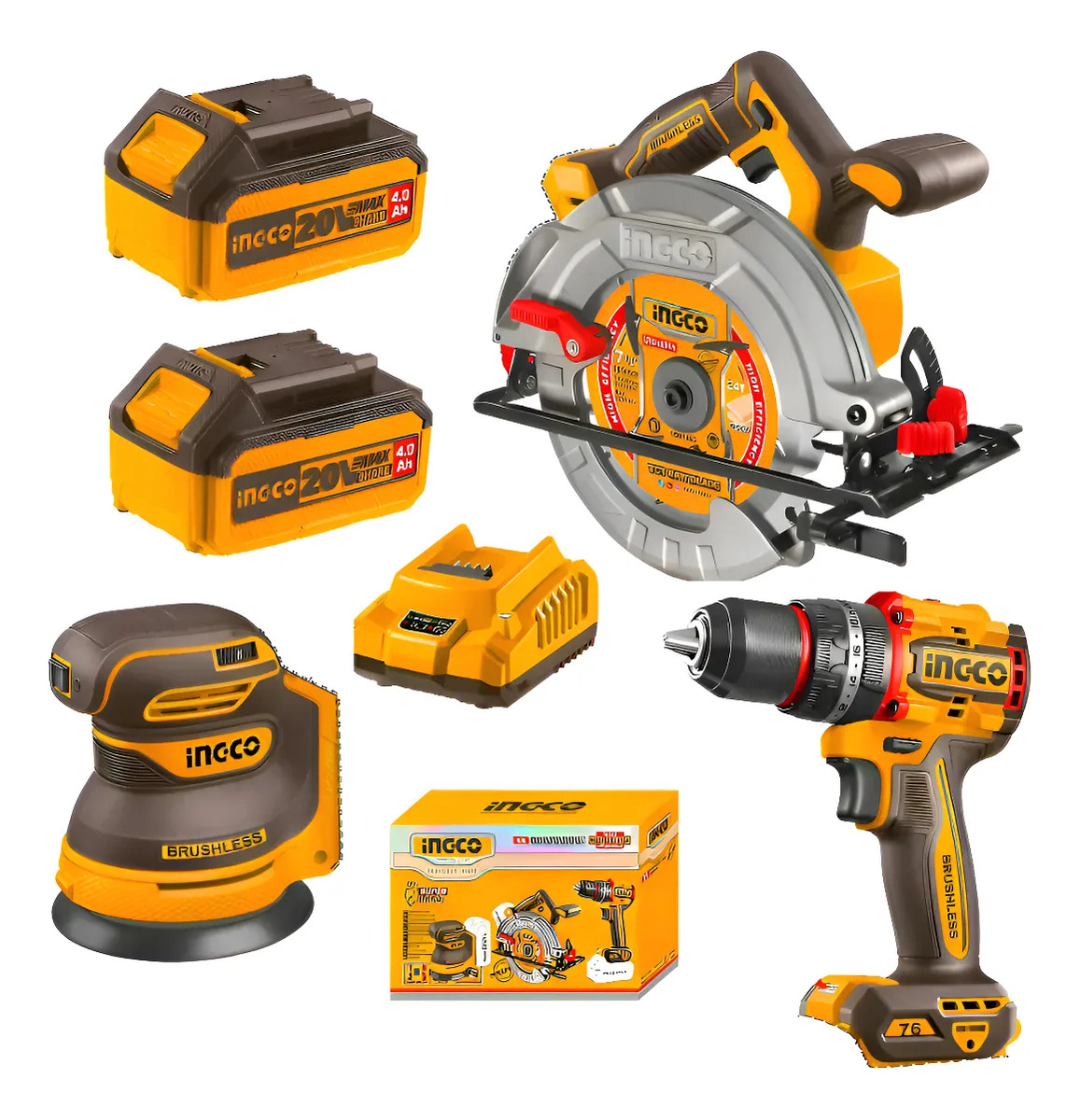 KIT COMBO A BATERIA P20S BRUSHLESS SIERRA CIRCULAR + LIJADORA ROTO ORBITAL + TALADRO ATORNILLADOR C/PERCUTOR 76NM + 2 BAT, CARGADOR Y ACCESORIOS INGCO COSLI250181