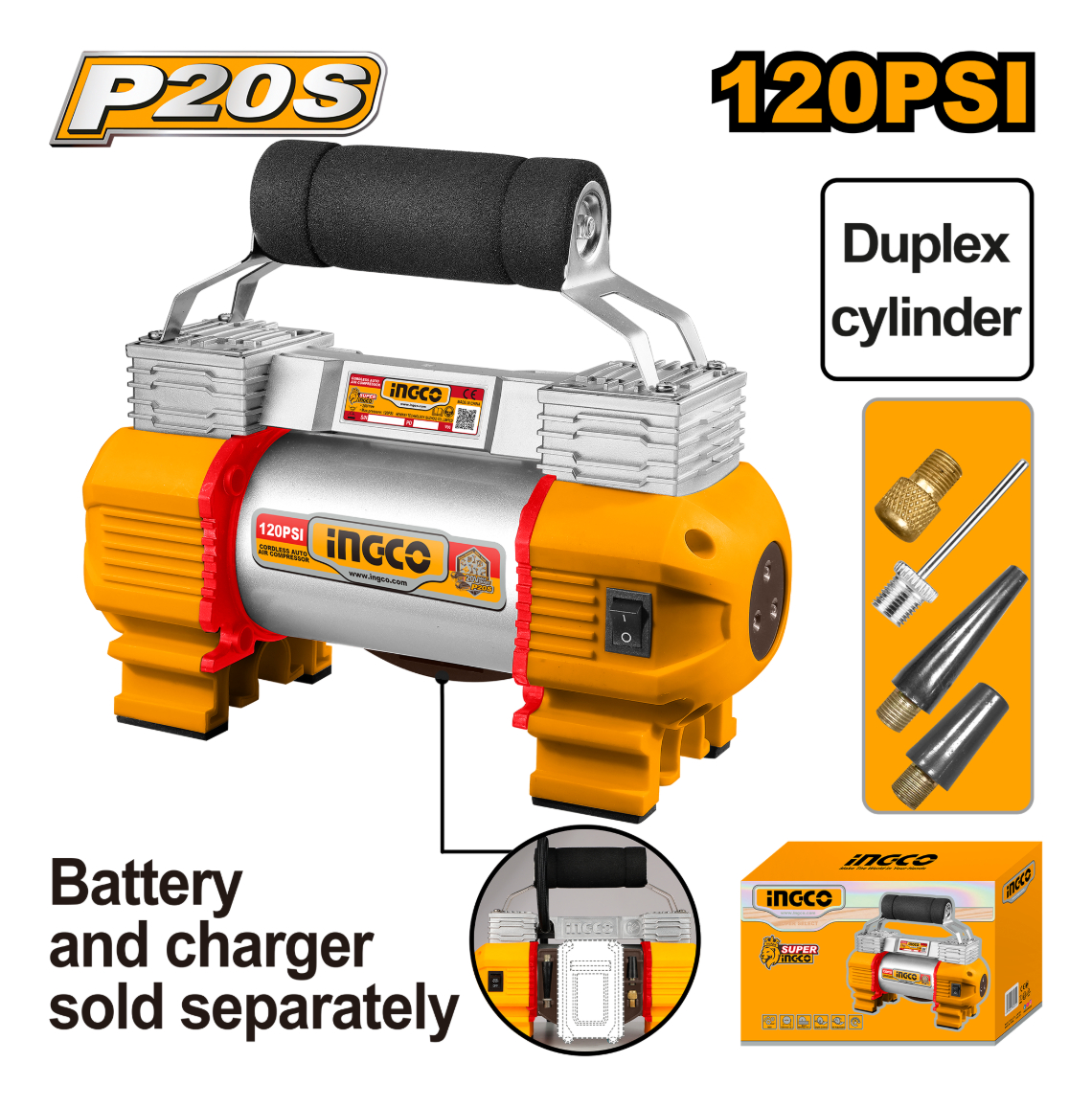 COMPRESOR DE AIRE A BATERIA 120PSI 8.27 BAR 20V P20S + ACCESORIOS, SIN CARGADOR Y SIN BATERIA INGCO CACLI2026