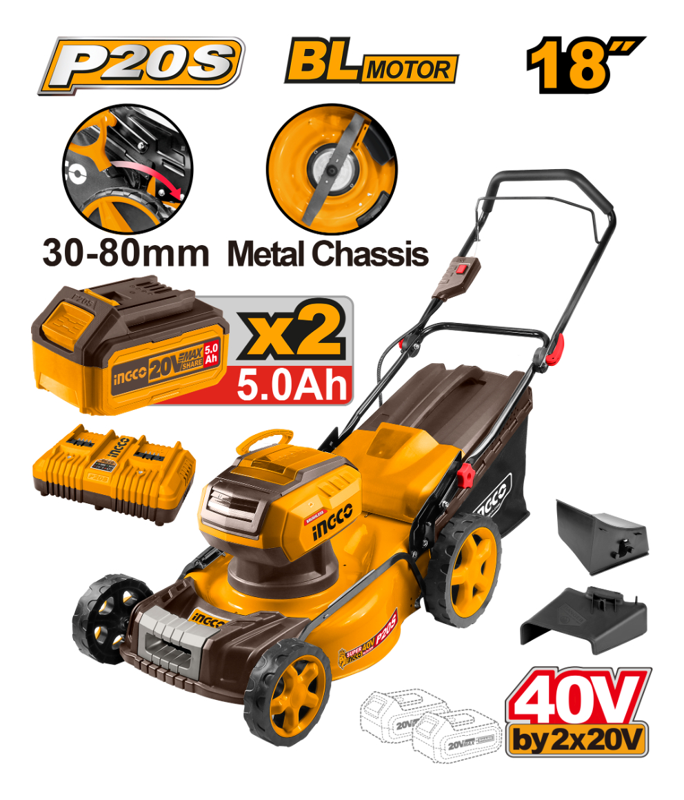 CORTA CESPED 18″ A BATERIA P20S 20V + 2 BAT 5.0AH + CARGADOR DOBLE + ACCESORIOS