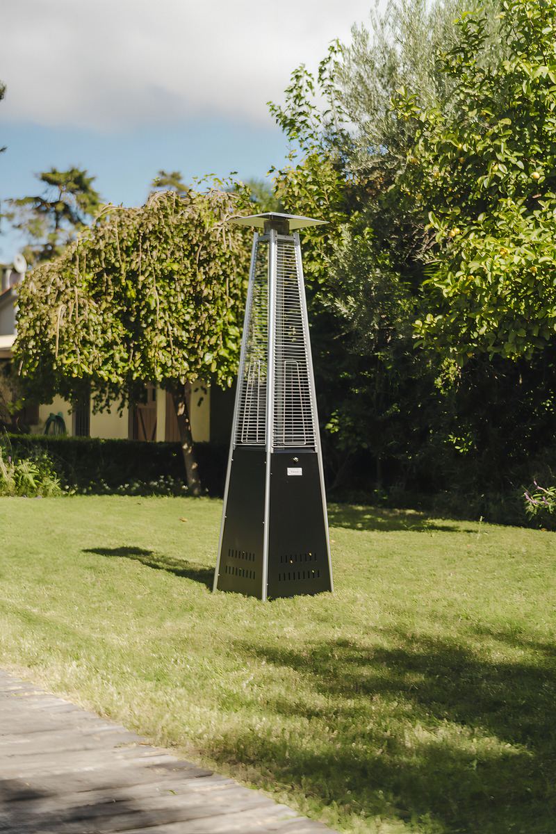 La estufa de patio piramidal Kassel es una opción moderna y potente para climatizar espacios exteriores, combinando diseño elegante con alto rendimiento. Su estructura vertical con llama visible crea un ambiente cálido y sofisticado, ideal para terrazas, jardines, bares y restaurantes.