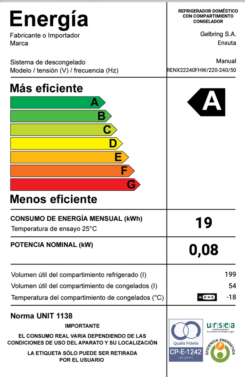 Capacidad de refrigerador: 198 Lts.