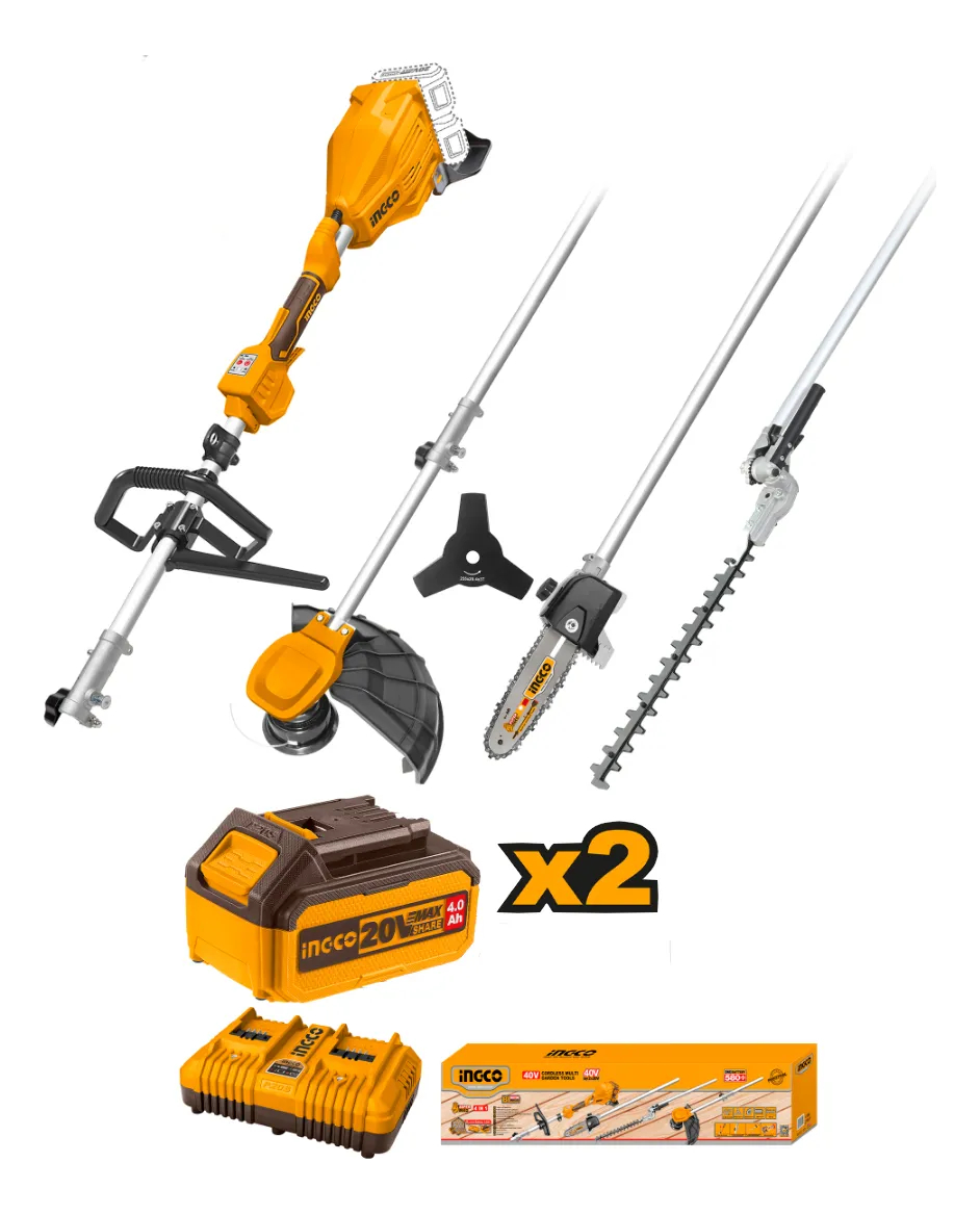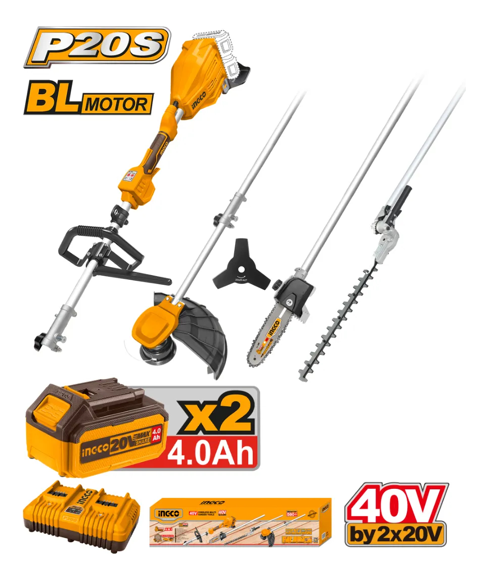 HERRAMIENTA MULTIFUNCIÓN DE JARDÍN A BATERÍA 4 EN 1 BRUSHLESS MOTOR P20S 40V C/2 BAT + CARGADOR DOBLE + ACCESORIOS INGCO