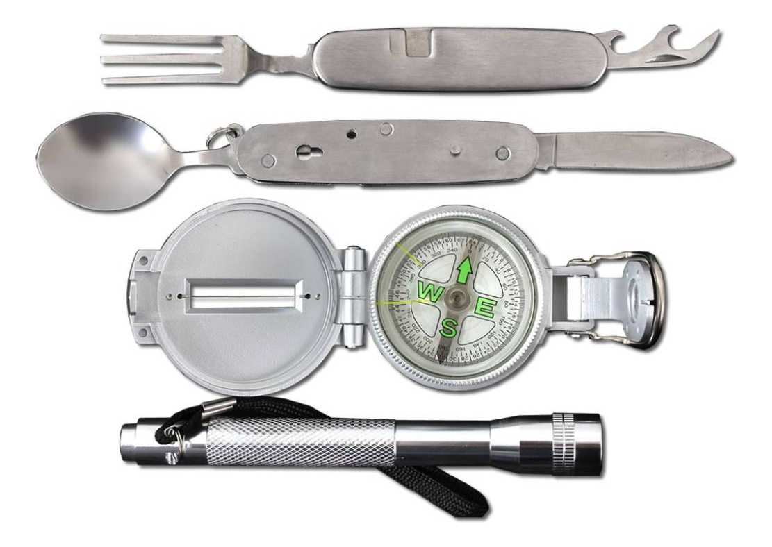 Uso Militar / Policial / Scout. Incluye brújula plateada con linea de marcha luminosa y ajustable, y visor con aumento + linterna plateada + multifunción que se puede desmontar para usar por separado. Incluye cuchara, tenedor, navaja y destapador / abrelatas. –