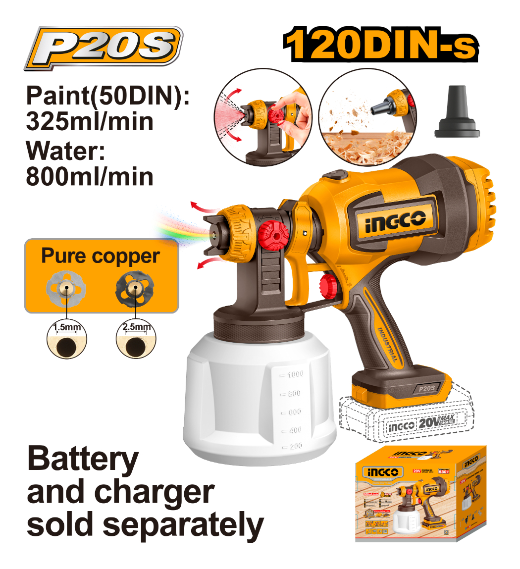 PISTOLA DE PINTURA A BATERÍA P20S 20V C/ACCESORIOS, S/BAT S/CARG INGCO CSGLI2004
