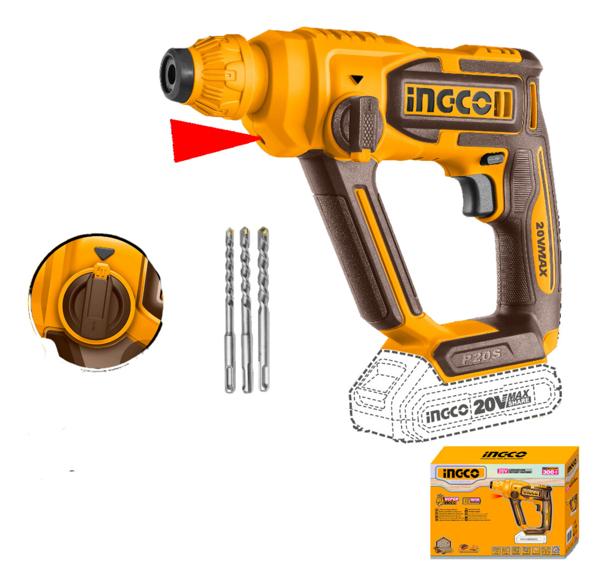 ROTOMARTILLO A BATERIA 20V P20S 16MM 2 FUNCIONES SIN BAT SIN CARG INGCO CRHLI20168