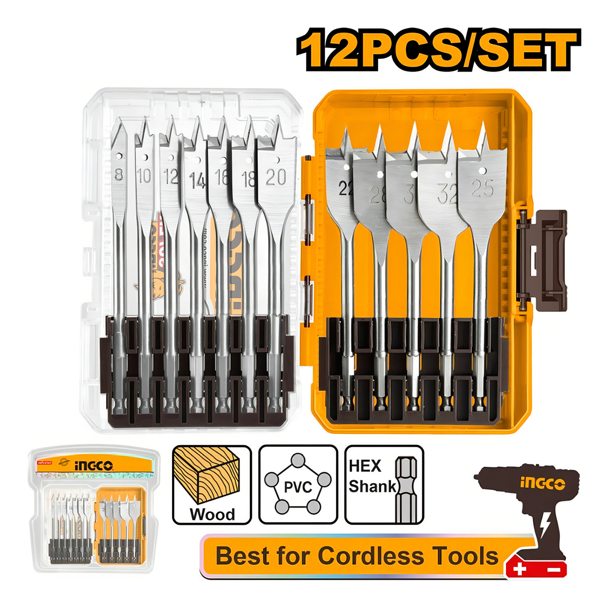 Set De 12 Brocas Mechas Planas Madera Ingco 8-32 Akdl1206