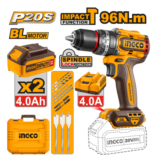 TALADRO ATORNILLADOR PERCUTOR A BATERÍA 20V P20S BRUSHLESS 96NM C/2BAT, CARGADOR, VALIJA Y ACCESORIOS INGCO CIDLI20968