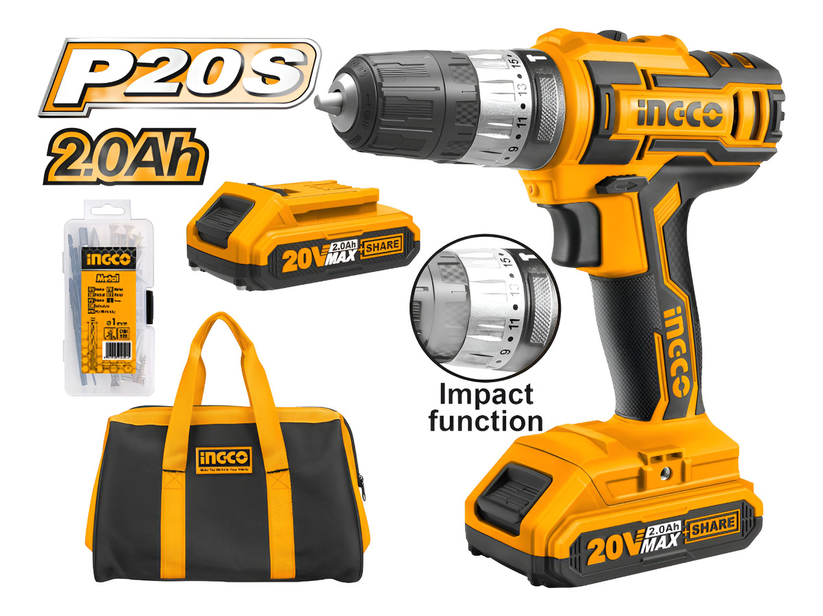 TALADRO PERCUTOR ATORNILLADOR (ECO) 10MM 20 VOLT CON 2 BAT BOLSO LITIO P20S INGCO CIDLI20025