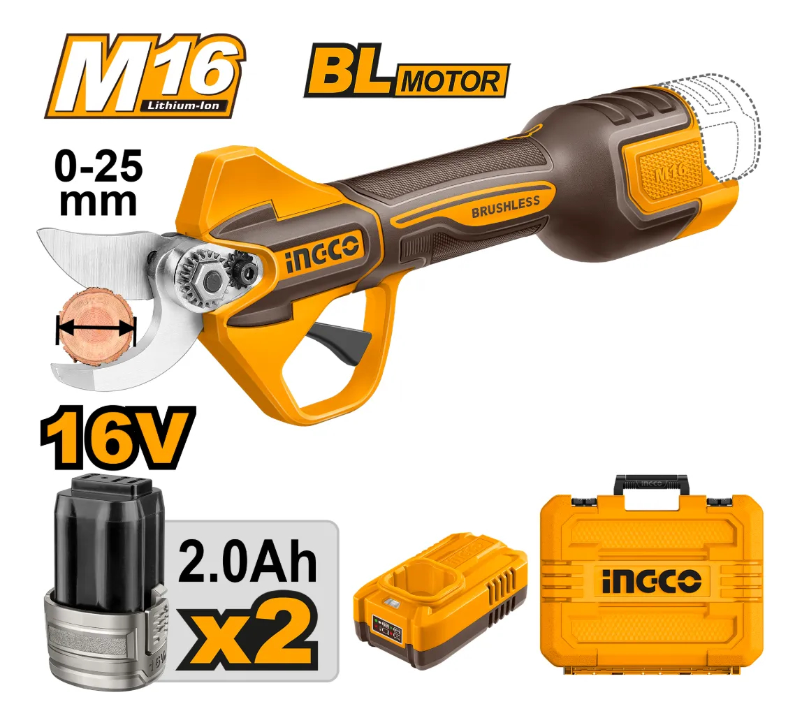 TIJERA DE PODA A BATERIA 16V BRUSHLESS 25MM + 2 BAT 2.0AH + CARGADOR + VALIJA